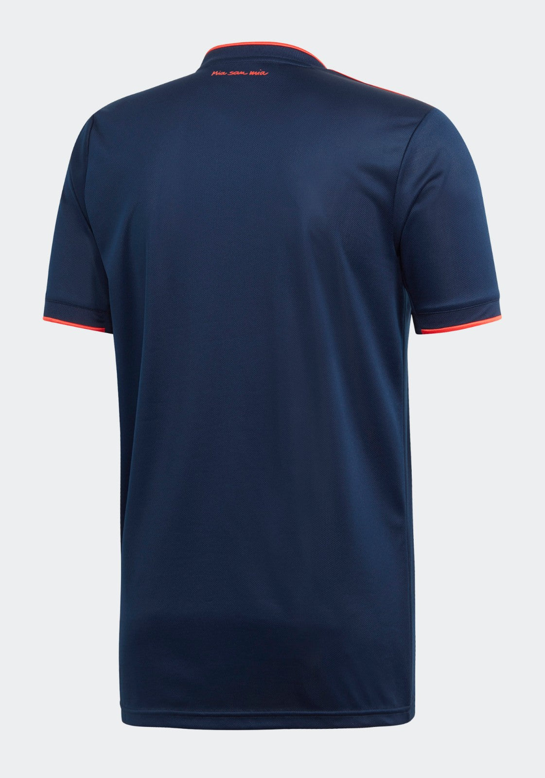 The Bayern Munich 19-20 Third Jersey is a bold and innovative sportswear item that breaks away from tradition. It features a vibrant navy blue color with a subtle diamond pattern on the front, symbolizing power and precision. The jersey is made from lightweight, breathable fabric for optimal comfort and durability. It has a modern crew neck collar, short sleeves, and strategically placed mesh panels for enhanced ventilation. The Bayern Munich crest and adidas logo are prominently displayed, and sponsor logos are seamlessly integrated into the design. The jersey represents the club's boldness and commitment to excellence, making it a must-have for fans who appreciate unique and standout sportswear.