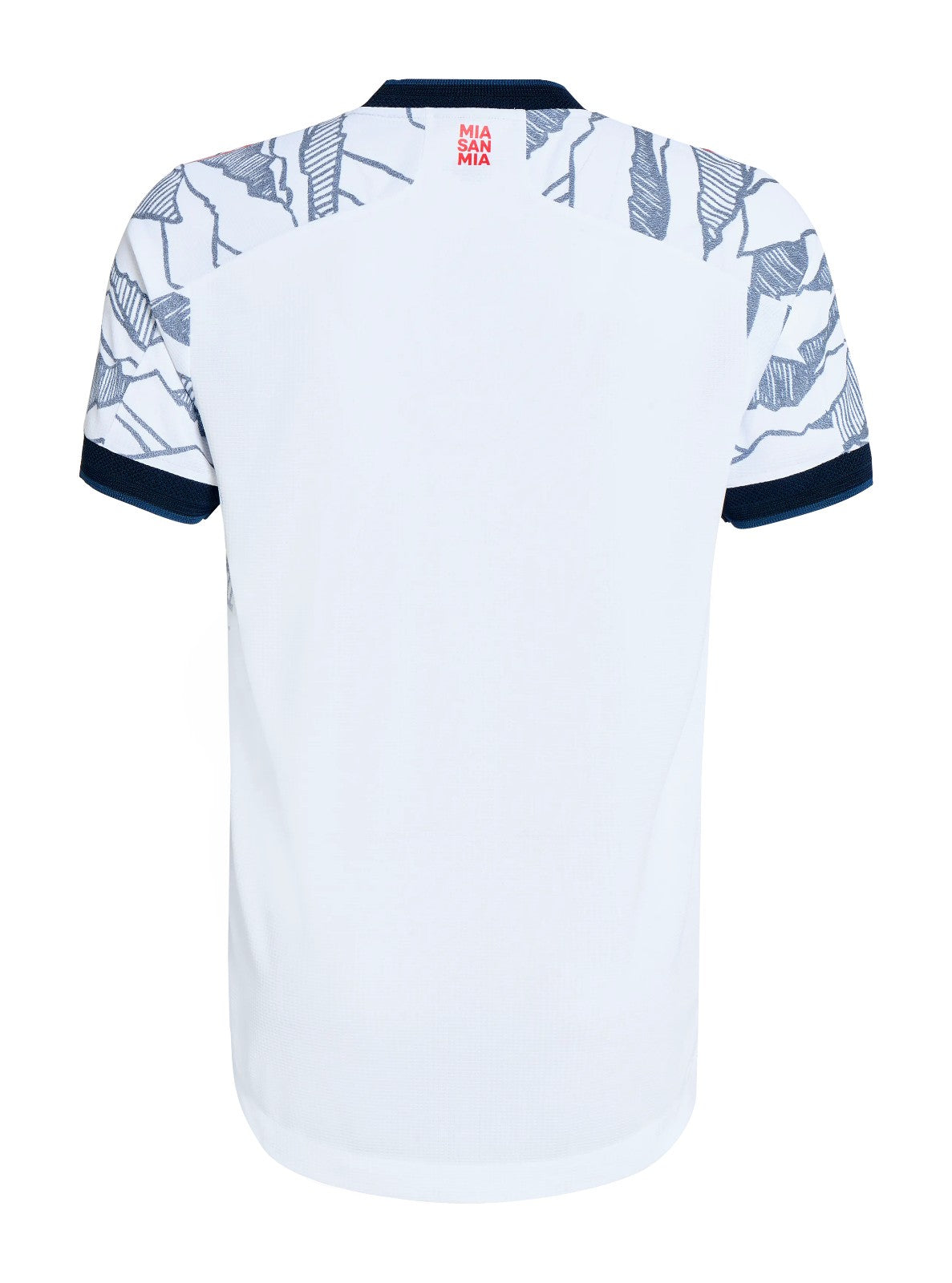 The Bayern Munich 21-22 Third Jersey is a bold and innovative kit that breaks from tradition while still embodying the spirit of FC Bayern Munich. It features a dark teal base color with vibrant coral details, creating a visually captivating design. The jersey is made with performance-focused fabric, providing comfort, breathability, and flexibility. It has an athletic fit with a modern crewneck collar. The club crest and Adidas logo are prominently displayed, along with the sponsor logo. Unique details include a "Mia san mia" inscription on the collar and a dynamic graphic pattern inspired by Bavarian diamonds on the sleeve cuffs. The jersey is available in various sizes, catering to fans of all ages. It represents the club's commitment to innovation, style, and its rich heritage.