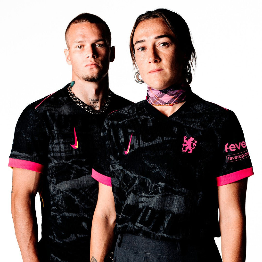 The Nike Chelsea FC 2024-25 third jersey features a striking combination of grey and black as the primary colours, accented with bold pink details. The standout feature of this kit is the upside-down Swoosh, a fresh design element from Nike for their 24-25 third kits. The large Swoosh is yellow, while the smaller Swoosh is pink, creating a unique and eye-catching look.