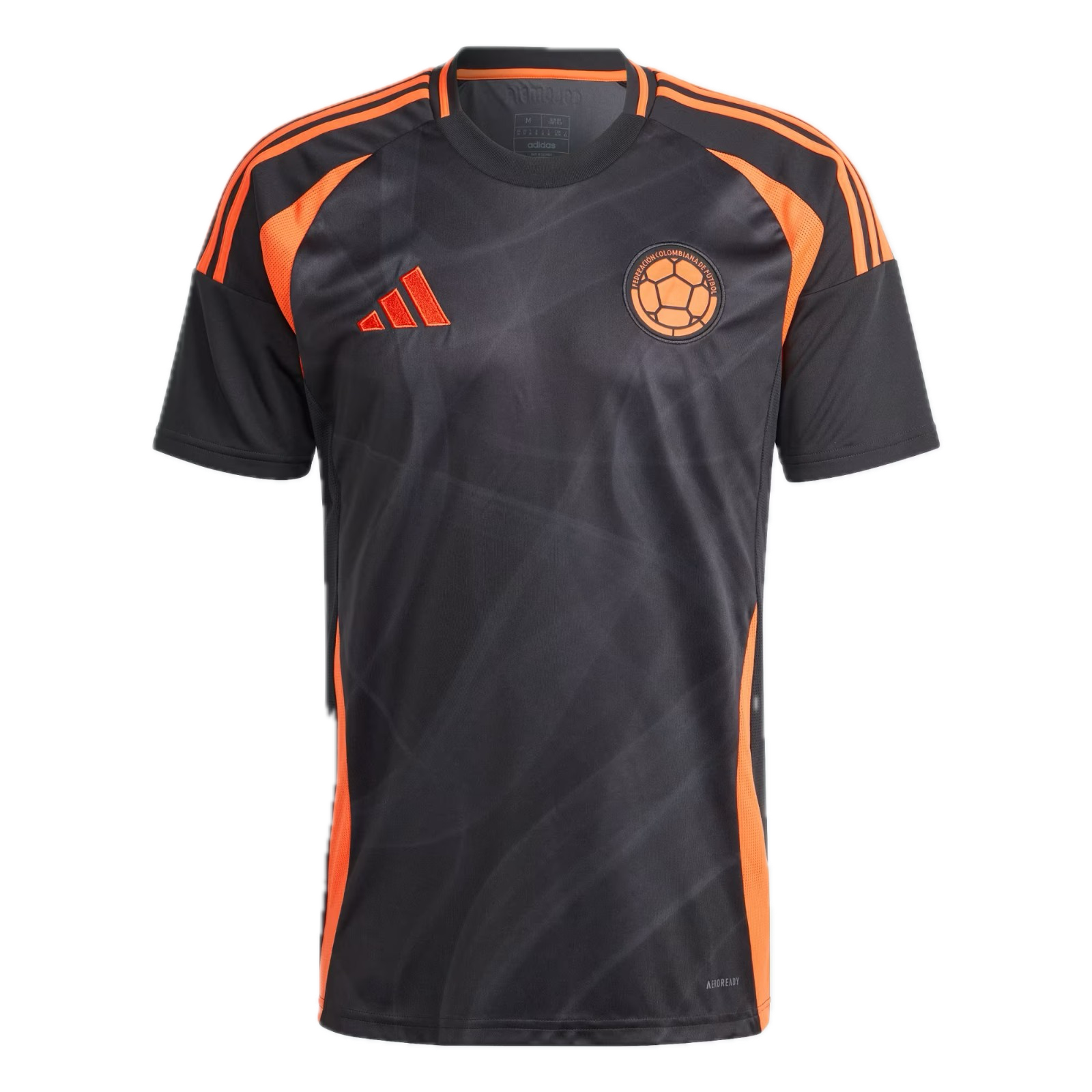 The Adidas Colombia 2024 away jersey features a contemporary color palette, predominantly black, accentuated by bold orange logos and applications.