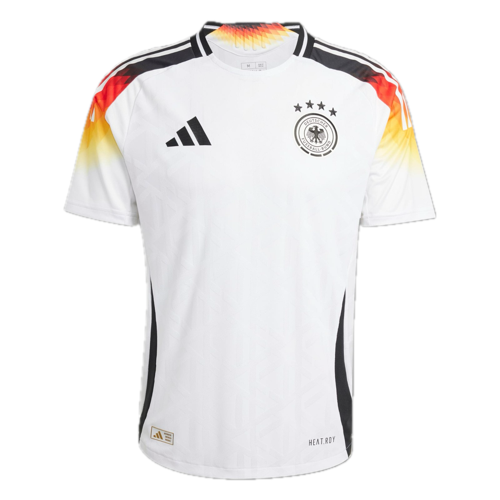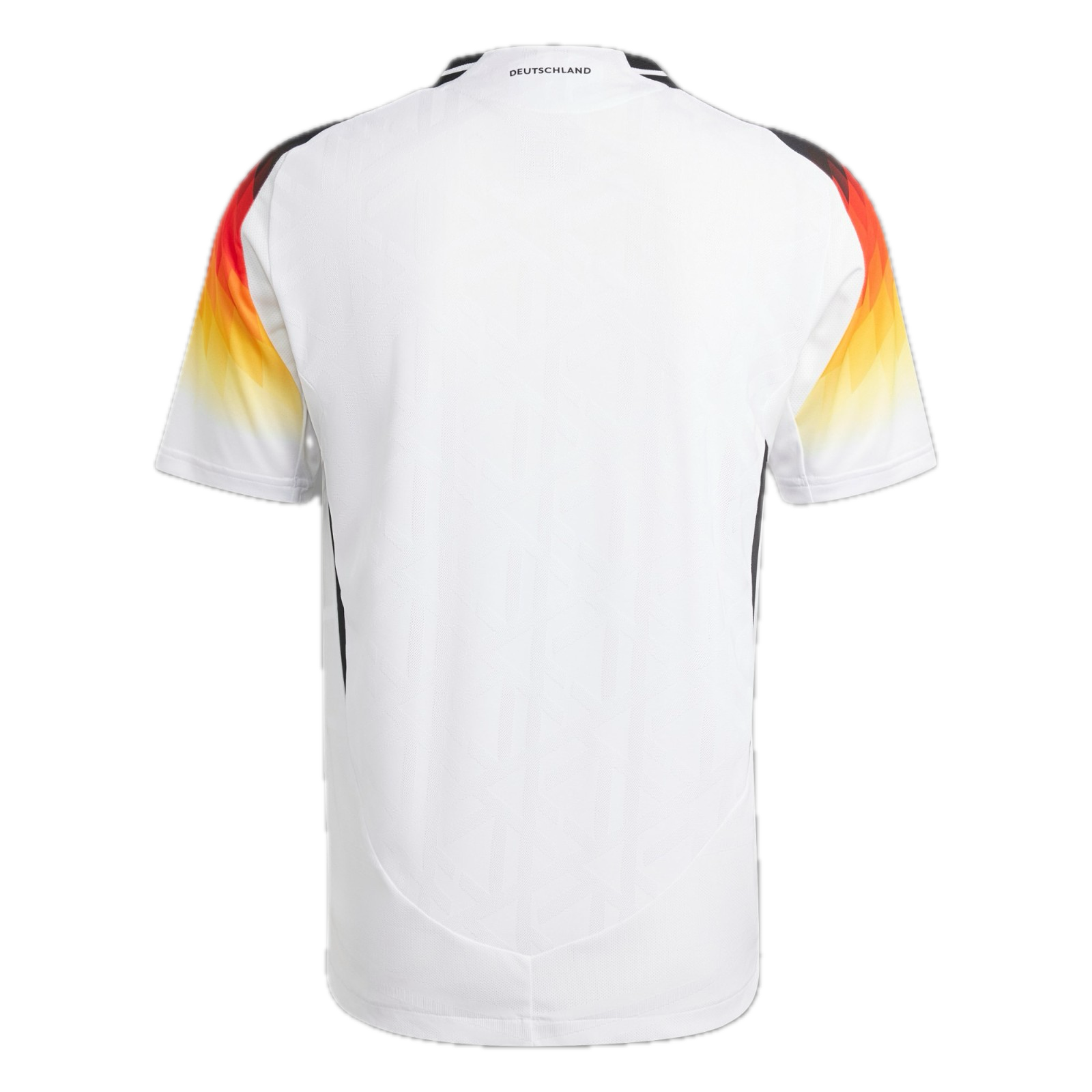 The Adidas Germany 2024 home football shirt has a modern and outstanding design. It is, of course, mainly white. Adidas combine the Adidas DFB Euro 2024 home shirt with a black Adidas logo and, more interestingly, the tricolor of Germany's flag. The sleeves come in the tricolor-gradient of the German flag, with white Three Stripes over it. This creates a spectacular look. On the front of the Germany Euro 2024 home kit is a pattern made up of the DFB logo. The side panels are black.