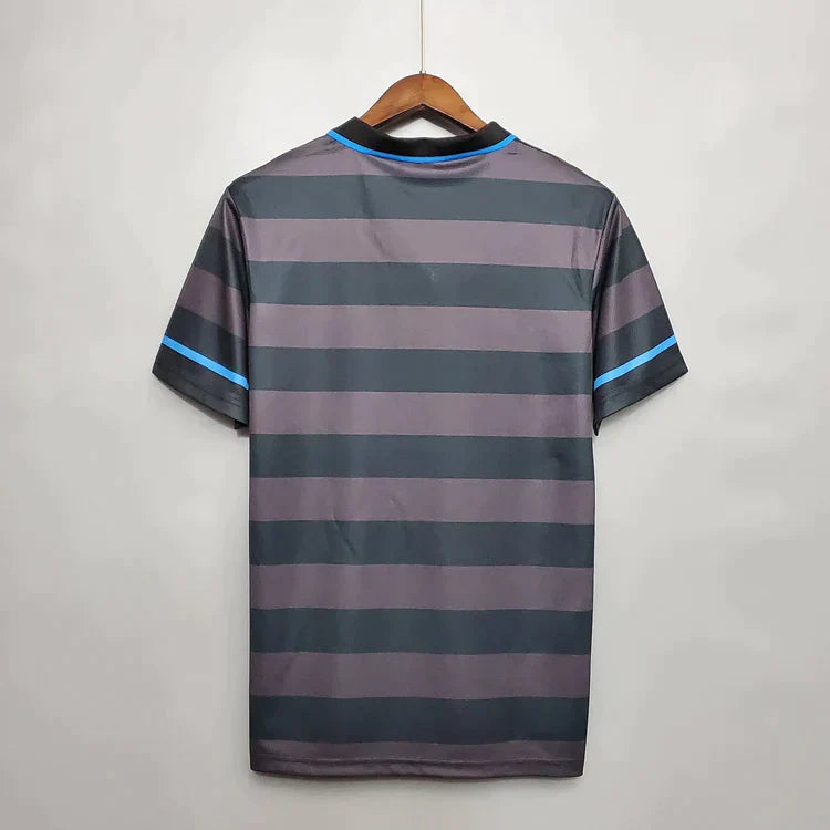 The Inter Milan 97/98 Away Jersey is a notable football jersey worn by Inter Milan during the 1997-1998 season. The jersey features a predominantly white colour with black and blue accents, which are the traditional colours of the club. It showcases a unique design with thin vertical stripes in varying shades of blue, creating a visually appealing look. The Inter Milan crest is proudly displayed on the chest, along with the sponsor logo. The jersey is made from high-quality materials to ensure optimal comfort and performance on the field. The Inter Milan 97/98 Away Jersey holds significance as it represents a specific era in the club's history and is cherished by Inter Milan fans worldwide.