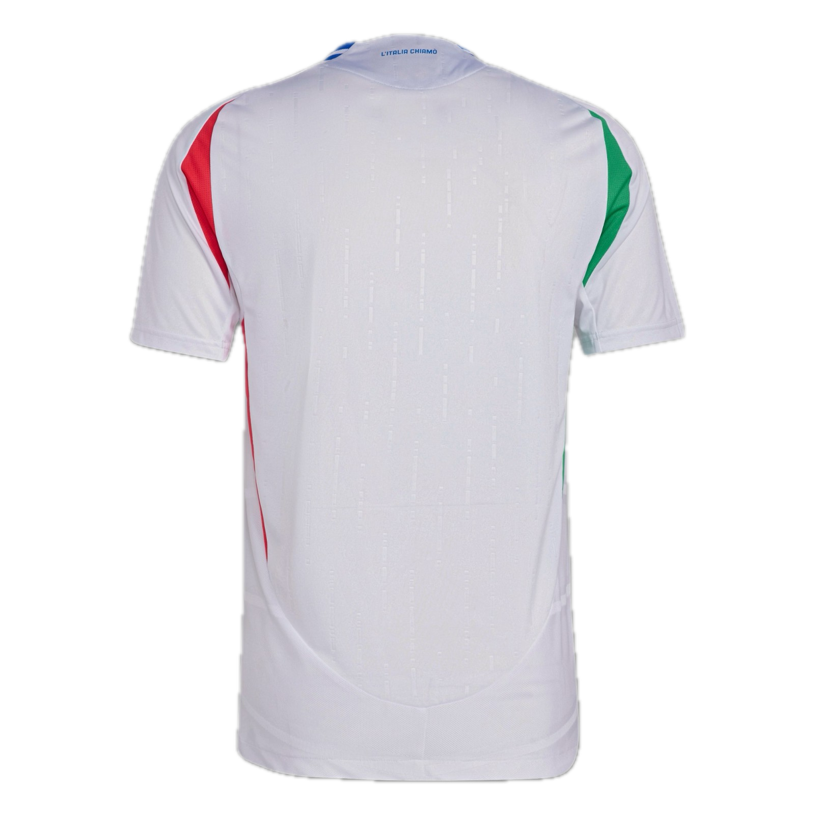 The Adidas Italy 2024 away jersey combines a white base with blue logos. What let the Adidas Italy 2024 away jersey stand out are the panels on both sides.