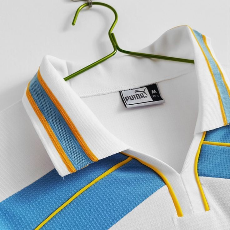 The Lazio 98/00 Away Jersey is a classic and iconic design worn by the Italian club during that period. The jersey features a predominantly white colour with a subtle light blue and navy blue trim. It has a V-neck collar and short sleeves, providing a comfortable fit for players and fans alike. The Lazio crest is prominently displayed on the left side of the chest, symbolizing the team's pride and identity. The jersey is made from high-quality materials, ensuring durability and breathability. The Lazio 98/00 Away Jersey is a timeless piece that represents the club's history and allows fans to showcase their support for the team.