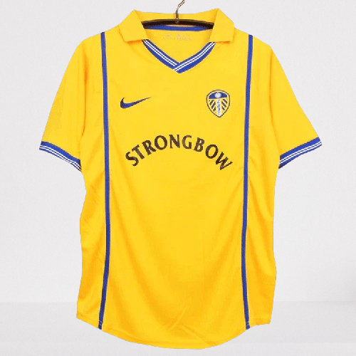 The Leeds United 00/02 Away Jersey is a stylish and distinctive design worn by the club during the 2000-2002 seasons. The jersey features a predominantly yellow colour with blue and white accents. It has a round neckline and short sleeves, providing a comfortable fit. The Leeds United crest is proudly displayed on the left side of the chest, representing the club's heritage and identity. The jersey is made from high-quality materials that ensure durability and comfort. It also features sponsor logos and other detailing, adding to the overall aesthetic appeal. The Leeds United 00/02 Away Jersey is a popular choice among fans, allowing them to showcase their support for the club in style.