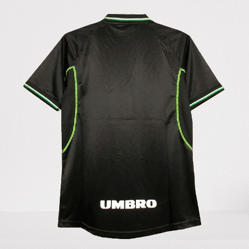 The Manchester United 98/99 Third Jersey is a notable jersey worn by the club during the historic 1998-1999 season. This jersey features a unique design with a predominantly blue colour and a distinctive black and white diamond pattern across the front. The club crest is prominently displayed on the left chest, accompanied by the sponsor logo and the manufacturer's branding. The Manchester United 98/99 Third Jersey holds significant significance as it was worn during the club's famous treble-winning season, in which they secured the Premier League, FA Cup, and UEFA Champions League titles. This jersey represents the team's resilience, determination, and iconic moments that have become part of football folklore. It is highly regarded by Manchester United fans and collectors alike as a symbol of the club's success and triumph.