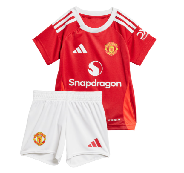 Equip young fans with the Manchester United 2024/25 Youth Home Full Kit. Showcasing the iconic red design with black and white accents, this kit features the club's crest and Adidas logo. Crafted from lightweight, breathable fabric with moisture-wicking technology, it ensures comfort and performance. The matching red shorts and socks complete the look, perfect for young Manchester United supporters and aspiring footballers. Durable and stylish, this kit lets them proudly represent Manchester United at Old Trafford and beyond.