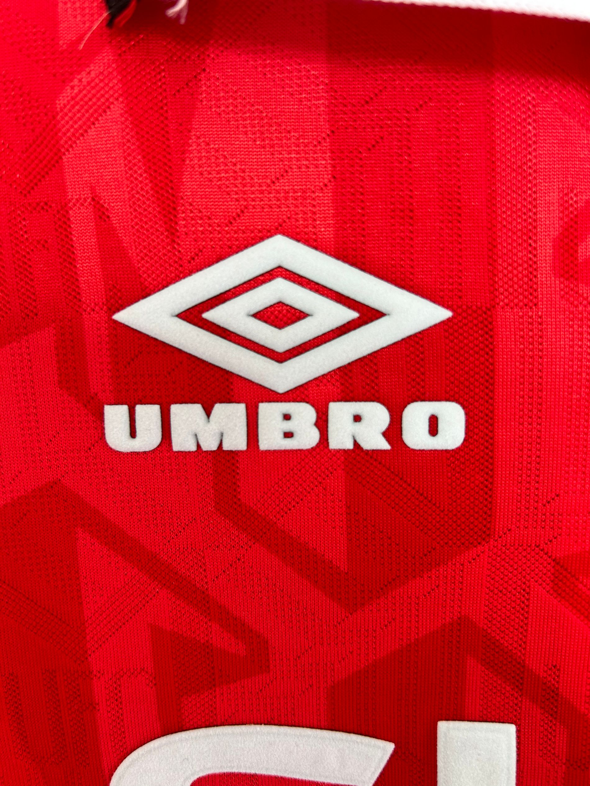 The Manchester United Home Jersey 1992/94 long sleeve is a legendary football shirt that represents a pivotal era in the club's history. This jersey, worn during the 1992 to 1994 seasons, features the classic red color with a distinctive lace-up collar, adding a vintage touch. The long sleeves provide extra warmth and coverage, ideal for colder match days. Made from high-quality, breathable fabric, it ensures comfort and durability for both players and fans. The Manchester United crest is prominently displayed on the chest, along with the iconic Sharp sponsor logo, symbolizing a successful period for the club. This jersey is a must-have for Manchester United fans and collectors, commemorating a golden era in the club's legacy.
