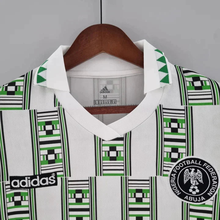 The Nigeria 93/94 Away Jersey refers to the away kit worn by the Nigeria national football team during the 1993-1994 football seasons. This iconic jersey gained worldwide recognition and became one of the most memorable football kits in history. The jersey featured a striking design with a vibrant green colour as the base, adorned with white chevron patterns that extended from the shoulders to the chest. The collar was rounded, and the sleeves were short for optimum comfort and freedom of movement. The Nigeria Football Federation badge was proudly displayed on the left chest, and various sponsor logos and team details completed the design. The Nigeria 93/94 Away Jersey holds a special place in football history, representing Nigeria's success during that period, including their participation in the 1994 FIFA World Cup. It has become an iconic symbol of Nigerian football and is highly sought after by collectors and fans alike.