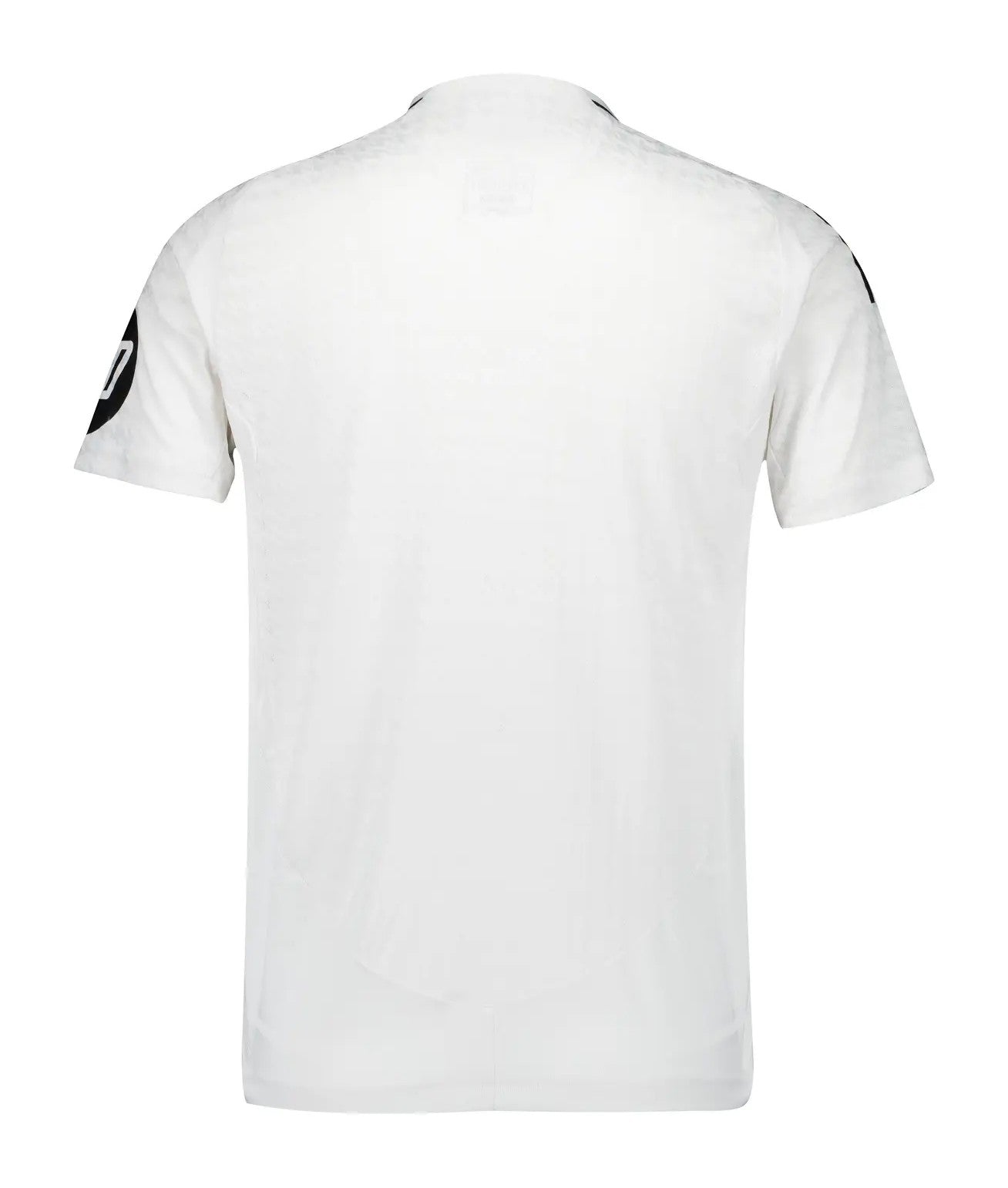 Embrace the legacy of Real Madrid with the 24/25 Home Jersey. This classic white jersey features luxurious golden accents and the iconic embroidered crest. Made with lightweight, moisture-wicking AEROREADY technology and eco-friendly materials, it offers comfort and sustainability. The jersey includes official sponsor logos and can be personalized with a name and number. Available in men's, women's, and kids' sizes, it's perfect for cheering from the stands or daily wear. Show your support for Los Blancos in style. Hala Madrid!