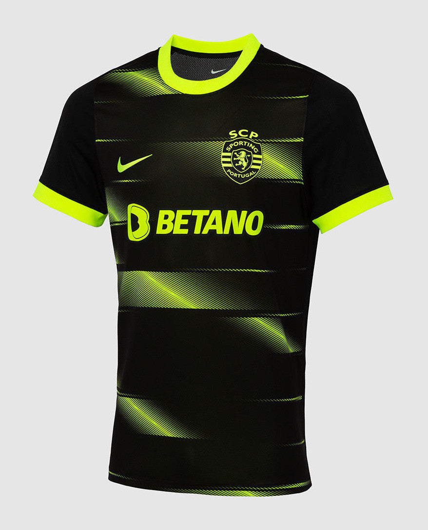 The Sporting CP 2022/2023 Away Jersey embodies boldness and global ambition. With a unique design featuring dynamic patterns, it reflects the club's fearless spirit. The crest and sponsor logos are prominent, and the jersey offers comfort and performance through advanced fabric technology. It signifies Sporting CP's international aspirations and is available in various sizes for fans who embrace the club's journey on the global stage. This jersey is a declaration of support for Sporting CP's pursuit of excellence worldwide.